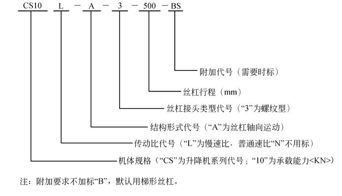 A型结构形式的附加要求有:滚珠丝杠型(B)、带防转装置(P)、带防护罩(S)共三种;