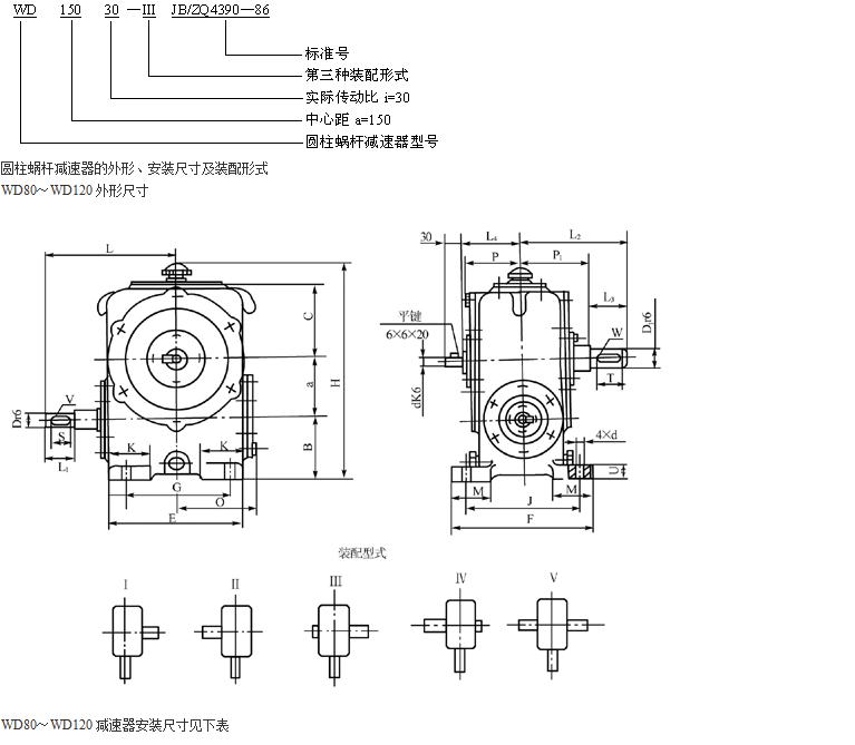 圆柱蜗杆减速器的标记包括:型号、传动比、装配型式